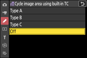 Esam pievienojuši [ Cikla attēla apgabals, izmantojot iebūvēto TC ] elementu pielāgoto iestatījumu izvēlnē pozīcijā f11 . Ja ir pievienots NIKKOR Z objektīvs ar iebūvētu telekonverteru, šī funkcija pārslēdz attēla apgabalu, kad foto režīmā tiek darbināts telekonvertera slēdzis, lai mainītu objektīva fokusa attālumu.