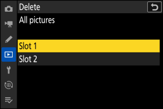 Naciskaj 1 lub 3 , aby wyróżnić gniazdo zawierające kartę pamięci, z której zdjęcia zostaną usunięte, a następnie naciśnij J .