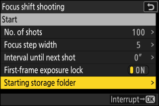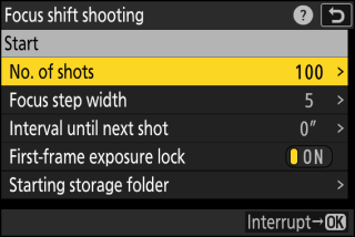 Przesunięcie ostrości zmienia odległość ustawiania ostrości w serii zdjęć. Wybierz stopień, w jakim odległość ogniskowania zmienia się przy każdym zdjęciu. |