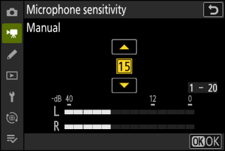 Reglați manual sensibilitatea microfonului. Alegeți dintre valorile de la [ ] la [ ]. Cu cât valoarea este mai mare, cu atât sensibilitatea este mai mare; cu cât valoarea este mai mică, cu atât sensibilitatea este mai mică. |