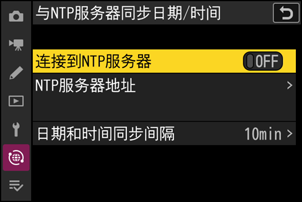 | [连接到NTP服务器] | 选择[ON]可将照相机连接至NTP服务器并同步其日期和时间。 |