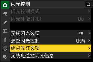 使用i菜单中的[]项目可查看组闪光灯选项,而使用自定义设定f1[]可将此项目添加至该菜单。