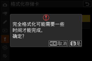 进行完全格式化会删除卡中所有区域的数据。若要确保删除所有数据,或者若注意到存储卡数据读写速度有所下降,请执行完全格式化。