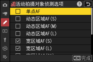 - 加亮显示选项并按下J或2确定选择(M)或取消选择(U)。在自动对焦模式下,仅当选择了带有勾选(M)标记的AF区域模式时才会启用拍摄对象侦测。