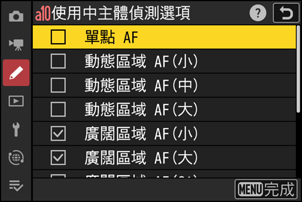 - 反白顯示選項並按下 J 或 2 確定選擇(M)或取消選擇(U)。在自動對焦模式下,僅當選擇了帶有核選(M)標記的 AF 區域模式時才會啟用主體偵測。