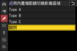 | [Type C] | 將鏡頭增距鏡開關滑至 1.4 倍會選擇 [DX(24×16)] 影像區域。將增距鏡開關滑至 1 倍不會更改影像區域。 |
