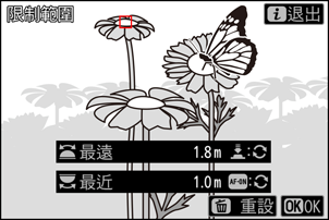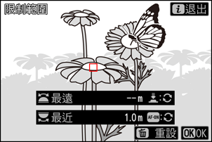 將對焦點置於最近距離處的主體上並按下 AF-ON 按鍵可設定最近距離。旋轉主指令撥盤或者按住 AF-ON 按鍵並同時旋轉鏡頭對焦環可微調最近距離。