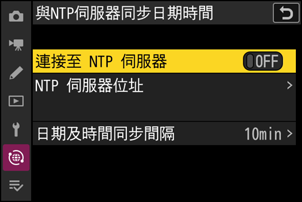 [連接至 NTP 伺服器] 選擇 [ON] 可將相機連接至 NTP 伺服器並同步其日期和時間。