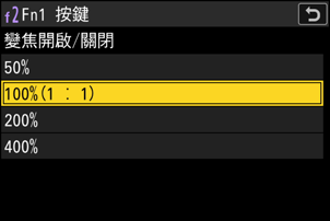 在可透過用戶設定 f2 [自定控制(拍攝)] 和 g2 [自定控制] 指定的 [變焦開啟/關閉] 的選項中,新增了 [400%] 的放大倍率。另外,其他選項的名稱更改為: