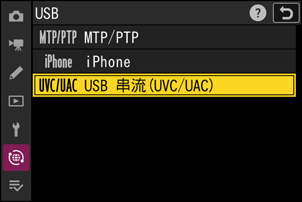 相機:在網路選單中選擇 [USB],反白顯示 [USB 串流(UVC/UAC)] 並按下 J。