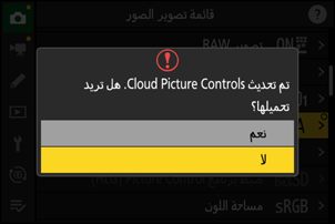 | [لا] | لا يتم تسجيل إعدادات برنامج التحكم بالصورة Picture Control المرسلة من Nikon Imaging Cloud والمستوردة إلى الكاميرا الخاصة بك على الكاميرا؛ بدلاً من ذلك، تعود الكاميرا إلى القائمة. في هذه الحالة، ستظهر علامات الإشعار على علامات تبويب قائمة تصوير الصور وتسجيل الفيلم وعلى عنصر [ضبط برنامج Picture Control] في قائمة الكاميرا.