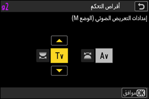 يمكن الآن تعيين تعويض التعريض الضوئي (E) وحساسية ISO (S) لتسجيل الفيلم إلى أقراص التحكم في الوضع M باستخدام الإعداد الاعتيادي g2 [عناصر التحكم الاعتيادية] > [أقراص التحكم] > [إعدادات التعريض الضوئي].
