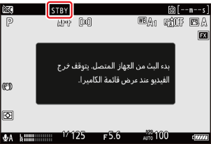 - ستظهر شاشة تصوير وضع الفيديو بغض النظر عن الإعداد المحدد لزر اختيار الصور/الفيديو. سيتم تطبيق إعدادات وضع الفيديو بما في ذلك توازن البياض وإعداد برنامج التحكم بالصورة Picture Control على صورة البث.