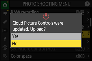 | [ Да ] | Когато свържете фотоапарата си към Nikon Imaging Cloud , контролите на изображението се изпращат от Nikon Imaging Cloud и се импортират във фотоапарата ви. Тези импортирани контроли на изображението все още няма да се показват на фотоапарата. Избирането на [ Да ] регистрира импортираните контроли на изображението във фотоапарата и ги добавя към списъка [ Задаване Picture Control ]. |