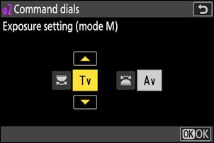 - Chcete-li nastavit role hlavního a pomocného voliče, vyberte v dialogovém okně [ Nastavení expozice ] režim M a stiskněte tlačítko DISP .