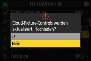 | [Nein] | Von Nikon Imaging Cloud auf Ihre Kamera übertragene Picture-Control-Konfigurationen werden nicht in der Kamera registriert; stattdessen kehrt die Kamera zum Menü zurück. In diesem Fall erscheinen Benachrichtigungszeichen bei den Registerkartensymbolen der Foto- und Videoaufnahmemenüs sowie bei [Picture Control konfigur.] im Kameramenü.