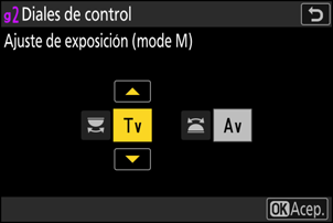 - Para establecer los roles de los diales de control principal y secundario, seleccione el modo M en el cuadro de diálogo [Ajuste de exposición] y pulse DISP.