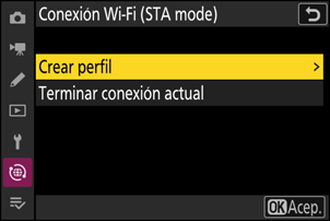 Cámara: Seleccione [Conectar con dispos. inteligente] > [Conexión Wi-Fi (STA mode)] en el menú de red y, a continuación, marque [Crear perfil] y pulse J.