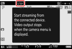 - Videotilan kuvausnäyttö tulee näkyviin valokuva-/videovalitsimen asetuksesta riippumatta. Videotilan asetuksia, mukaan lukien valkotasapaino ja Picture Control käytetään suoratoistettavaan kuvaan.