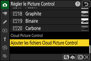 Si les Picture Control sont transférés sur l’appareil photo depuis Nikon Imaging Cloud, vous pouvez les télécharger et les lire via [Régler le Picture Control] > [Ajouter les fichiers Cloud Picture Control] dans le menu Prise de vue photo ou Enregistrement vidéo de l’appareil photo. Vous pouvez modifier ces Picture Control une fois sélectionnés et ajoutés dans l’appareil photo via [Gérer le Picture Control] dans le menu Prise de vue photo ou Enregistrement vidéo.