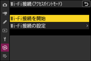 カメラ:ネットワークメニュー[スマートフォンと接続]>[Wi‑Fi接続(アクセスポイントモード)]で[Wi-Fi接続を開始]を選んでJボタンを押す