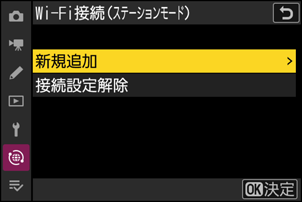 カメラ:ネットワークメニュー[スマートフォンと接続]>[Wi-Fi接続(ステーションモード)]で[新規追加]を選び、Jボタンを押す