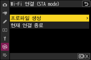 카메라: 네트워크 메뉴의 [스마트 장치로 연결] > [Wi-Fi 연결 (STA mode)]을 선택한 다음 [프로파일 생성]을 선택하고 J를 누릅니다.