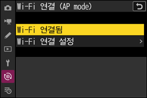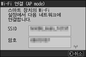 카메라: 네트워크 메뉴의 [스마트 장치로 연결] > [Wi-Fi 연결 (AP mode)]을 선택한 다음 [Wi-Fi 연결됨]을 선택하고 J를 누릅니다.
