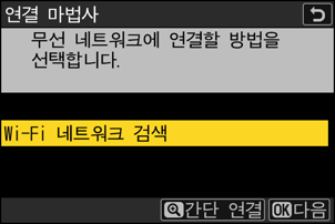 카메라: [Wi-Fi 네트워크 검색]을 선택하고 J를 누릅니다.