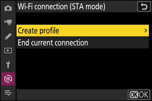 Fotoaparatas: tinklo meniu pasirinkite [ Prijungti prie išmaniojo įrenginio ] > [ Wi-Fi ryšys (STA režimas) ], tada pažymėkite [ Sukurti profilį ] ir paspauskite J